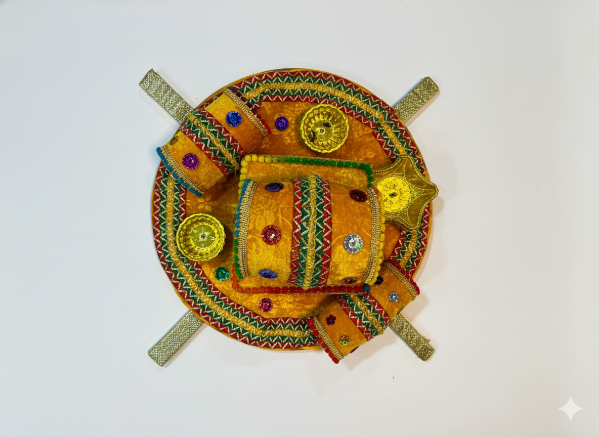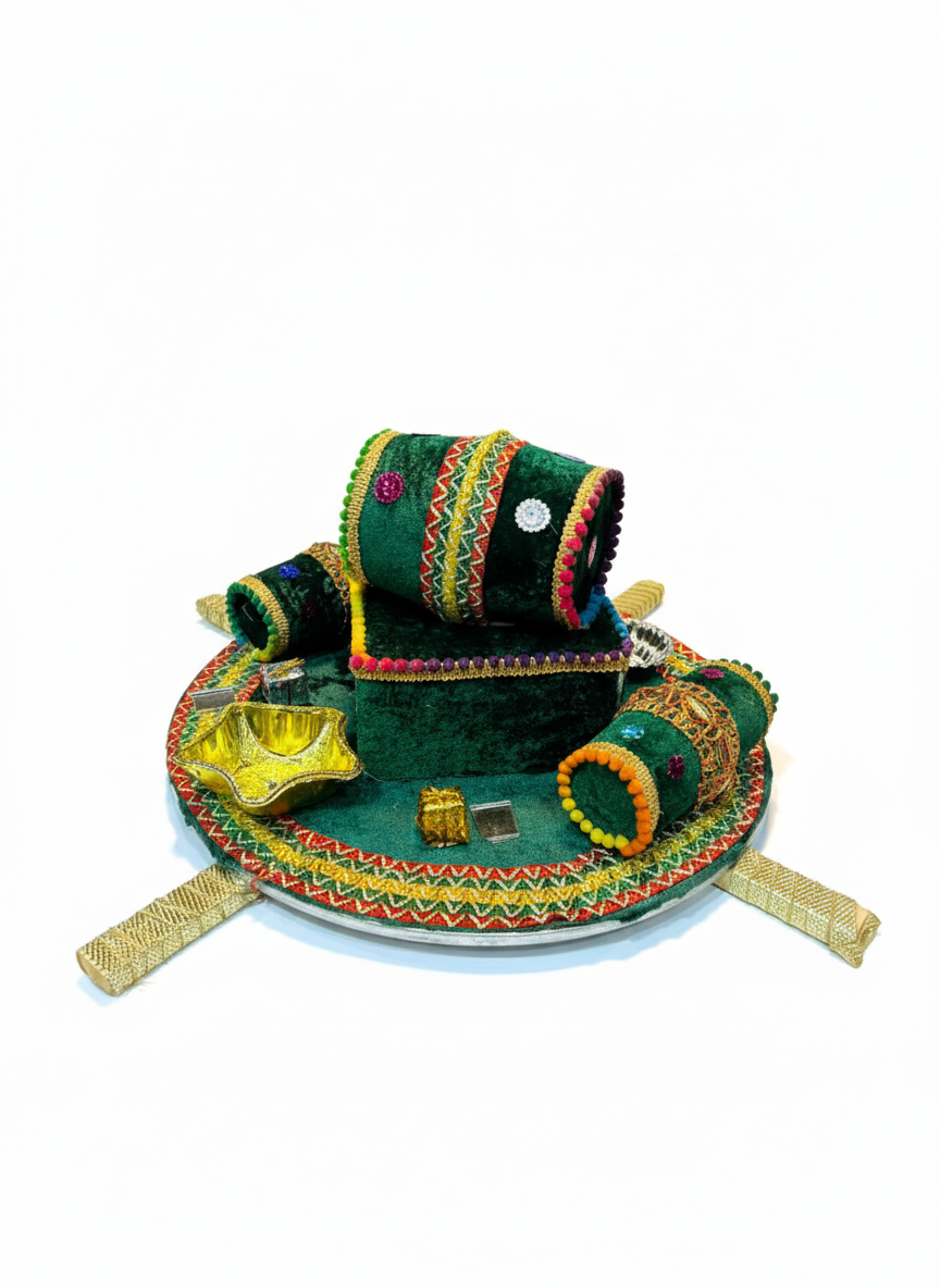 This vibrant and beautifully handcrafted Mehndi Thaali is a central ritual prop for the joyous pre-wedding ceremonies, primarily the Mehndi and Mayoun functions in South Asian culture. The thaali features a round, decorative base, typically adorned with festive velvet, intricate embroidery, glittering gotta work, and colorful bead detailing, reflecting the celebratory atmosphere of the events.