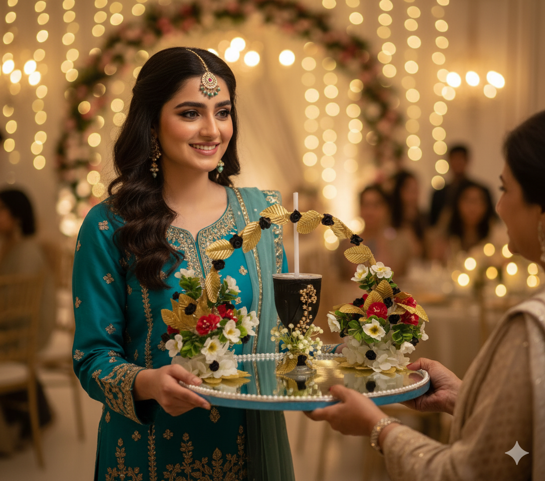Make your Doodh Pilai ceremony unforgettable with this elegant White, Black & Golden Floral Glass Set. Featuring a beautifully crafted big mirror tray, it adds luxury and charm to every wedding moment. Perfect for bridal rituals and gifting.
